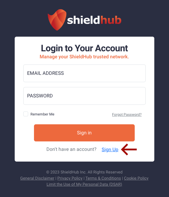 Visit www.shieldhub.com and click the Sign Up link under the login button.