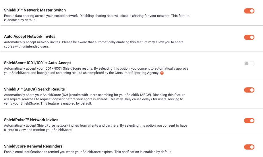 | ShieldScore IC01/IC01+ Auto-Accept | Automatically accept your IC01+/IC01 ShieldScore results. By selecting this option, you consent to automatically approve your ShieldScore and background screening results as completed by the Consumer Reporting Agency. |